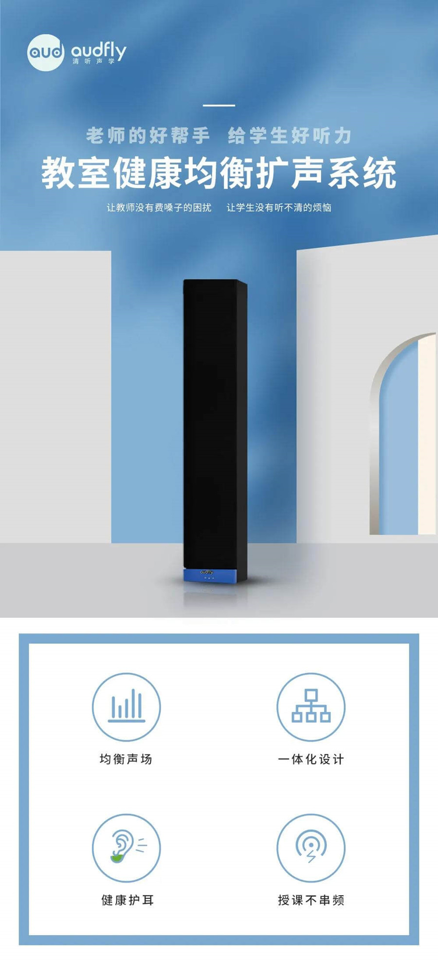 清聽聲學(xué)教學(xué)均衡健康擴(kuò)聲系統(tǒng),是業(yè)內(nèi)首個“五合一”一體化、專業(yè)級教室擴(kuò)聲設(shè)備,通過均衡健康的聲場設(shè)計,達(dá)到優(yōu)于美國標(biāo)準(zhǔn)的均衡指標(biāo),實(shí)現(xiàn)授課聲音的均勻傳播,呵護(hù)青少兒聽力健康。設(shè)備一體化設(shè)計,減少空間占用,提升安裝和使用便捷性、簡易性。
