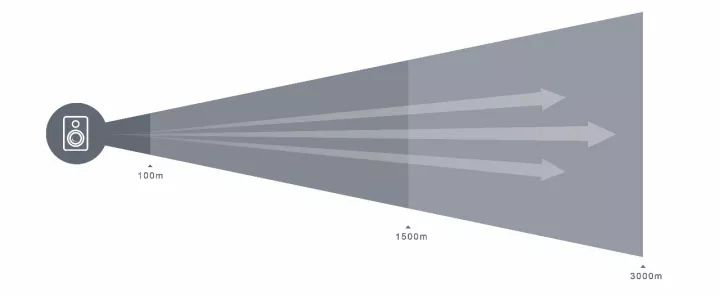 強聲定向裝備工作時發(fā)射一個波束角度為30°指向性聲波,可以廣播清晰的語音信息和高強度的警示音(實時語音或預(yù)錄語音均可),聲音傳輸距離最遠(yuǎn)達(dá)到6000米,而且聲音高度定向:正向區(qū)域內(nèi)聲音清晰、衰減低,后向和周邊區(qū)域聲音衰減迅速,干擾小。