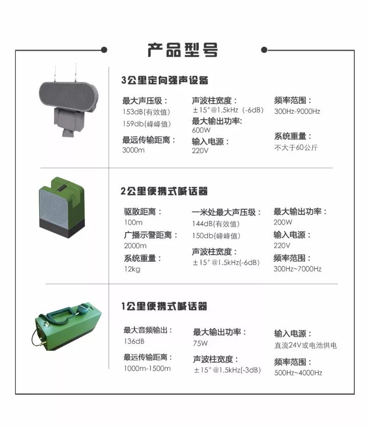 遠(yuǎn)距離喊話與警示,機場、大型艦船驅(qū)鳥,重要場所、關(guān)鍵區(qū)域防護(hù),反恐維穩(wěn),監(jiān)獄安防,海上執(zhí)法,邊境防衛(wèi),主權(quán)昭示……