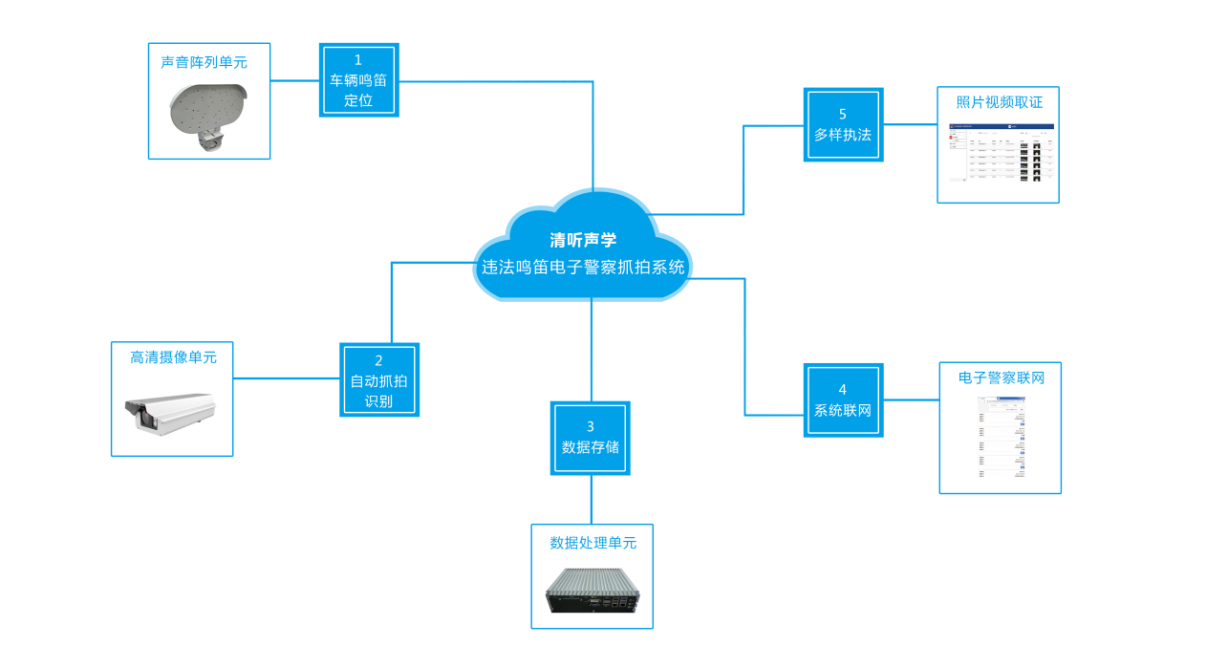 鳴笛抓拍系統行業解決方案是以國際先進的聲源定位技術為核心,以清聽聲學獨創的波達方向定位技術、波束形成技術、自動噪音抑制技術為基礎,對現有道路交通執法系統進行全面科技化、數字化升級,形成從數據采集、存儲、分析到執法提升的“綠色交通”閉環,提供完整的端 (采集終端)到端(執行終端)的智能應用解決方案。
